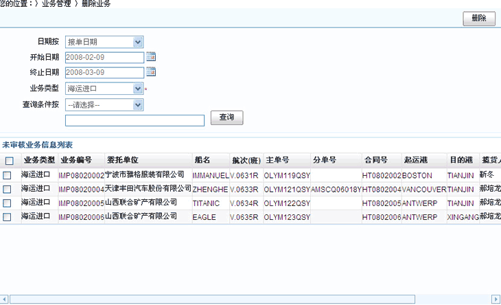 如果确实要删除一票业务,只有通过该模块才能完成,该模块权限要慎重分配,业务台帐一旦删除不能恢复。菜单【业务管理】-【删除业务】,进入删除业务页面: