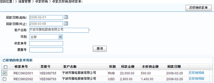 输入客户名称(必填)等查询条件后按【查询】按钮,列表会显示出符合查询条件的收款单记录,选择一条或多条记录按【反核销收款单】按钮,