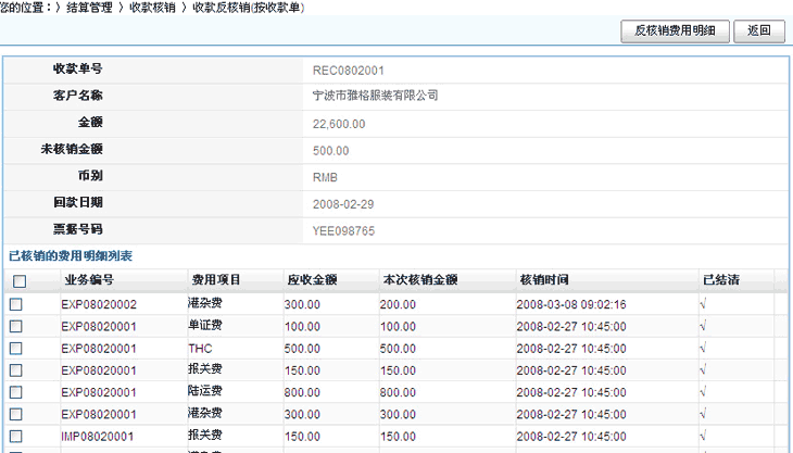 即完成了按收款单反核销操作。您也可以反核销这票收款单核销的应收明细,点击反核销明细超链接进入明细反核销页面: