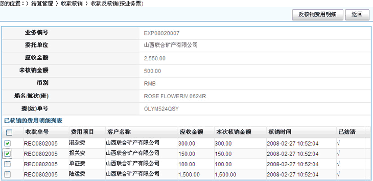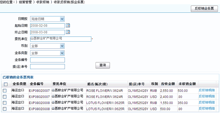 输入委托单位(必填)等查询条件后按【查询】按钮,列表会显示出符合查询条件的业务记录,选择一条或多条记录按【反核销业务票】按钮, 即完成了按业务票反核销操作。您也可以反核销这票业务的应收明细,点击反核销明细超链接进入明细反核销页面: