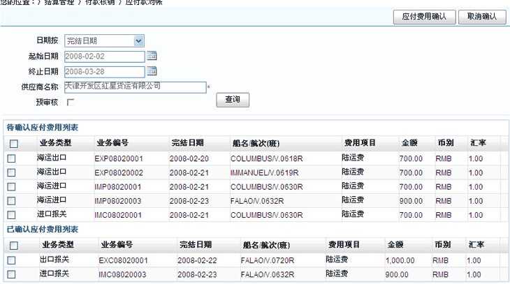 选择供应商名称后,按【查询】按钮,系统列出待确认的应付费用信息,与供应商帐单核对的过程中,如果一致则在列表前面的方框内挑勾, 核对后按【应付费用确认】按钮,系统就把您挑勾的记录标记为“已确认”,这时您可以看到已确认应付费用列表中会增加记录。