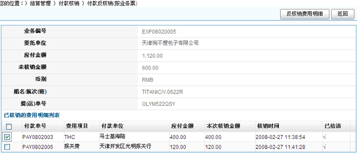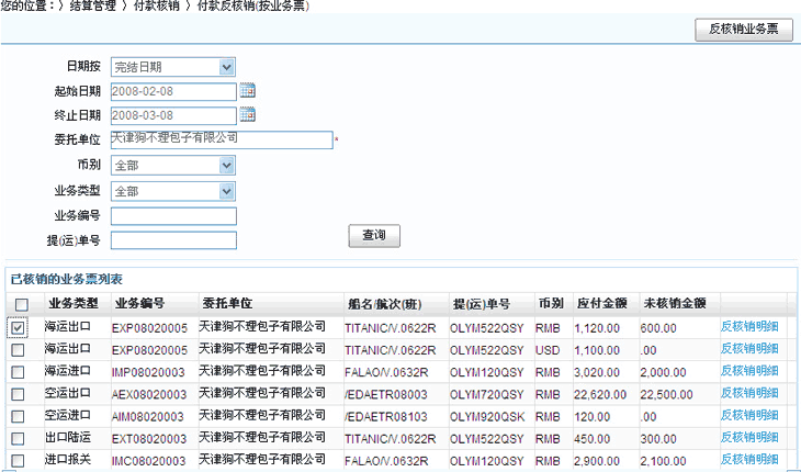 输入委托单位(必填)等查询条件后按【查询】按钮,列表会显示出符合查询条件的业务记录,选择一条或多条记录按【反核销业务票】按钮, 即完成了按业务票反核销操作。您也可以反核销这票业务的应付明细,点击反核销明细超链接进入明细反核销页面: